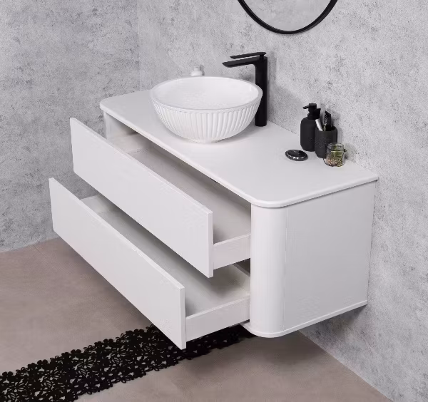 Dette baderomsskapet kombinerer innovativ funksjonalitet med elegant design. Skapet har to romslige skuffer utstyrt med både push-to-open-system og soft-close-mekanisme, gir det en brukervennlig opplevelse med enkel åpning og stille, myk lukking – perfekt for daglig komfort.