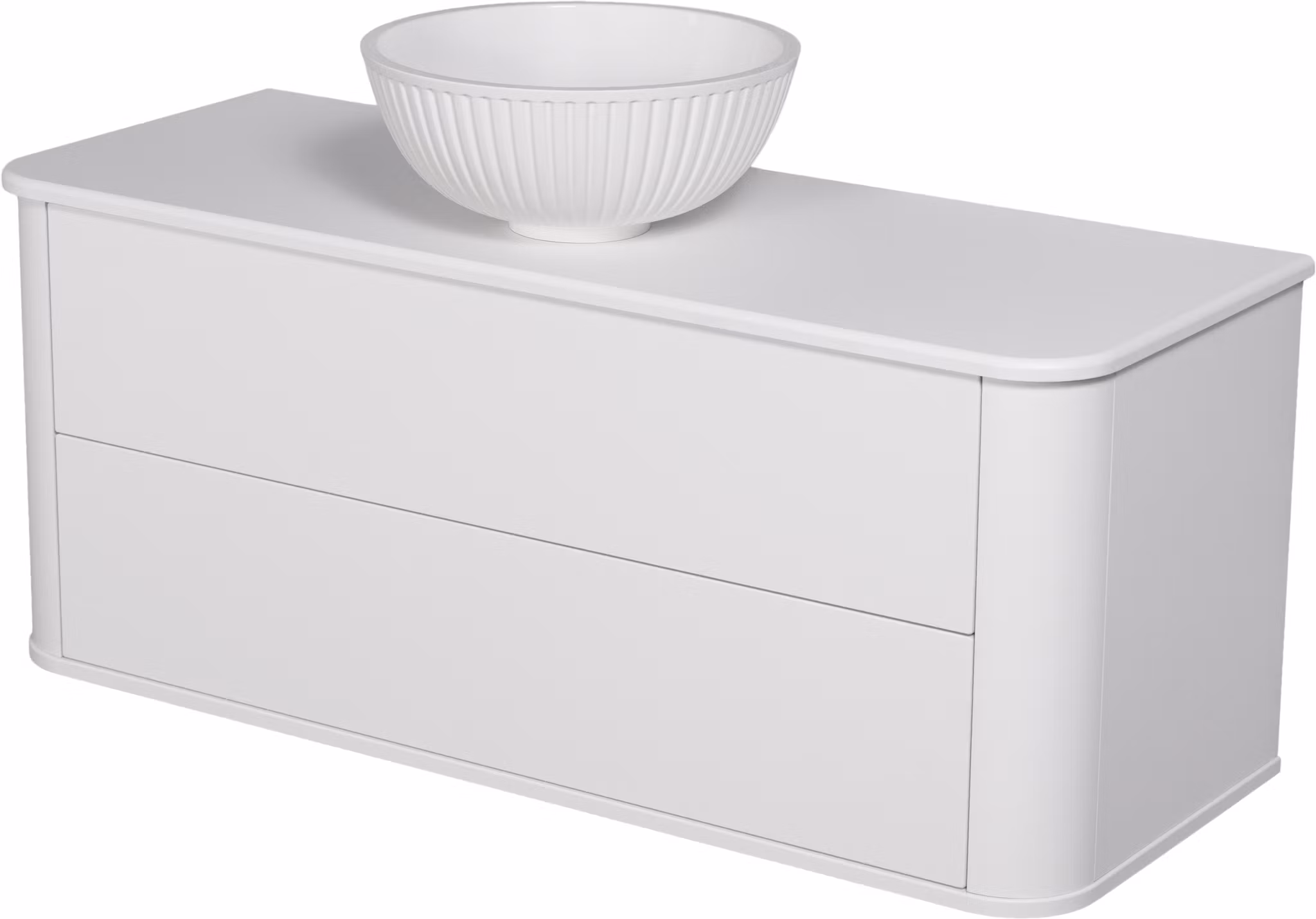 På benkeplaten plasseres en hvit dolomittservant med symmetrisk vertikale riller og glatt overflate – et design som skiller seg ut og samtidig er lett å rengjøre.