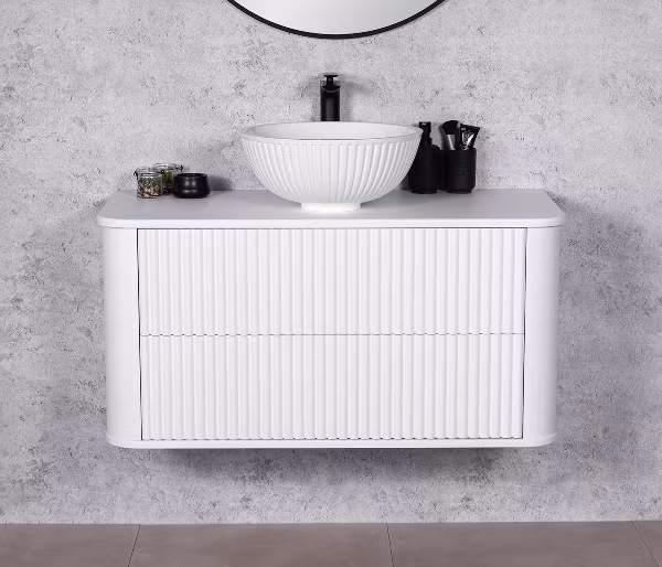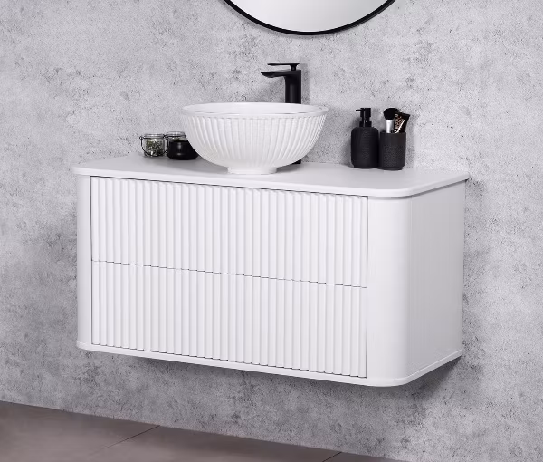 Vegghengt baderomsskap i matt hvit farge med rillet front – moderne eleganse og praktisk funksjon
