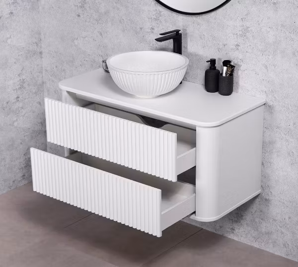 Skapet har to romslige skuffer med soft-close-system, som gir stillegående og behagelig bruk samtidig som innholdet beskyttes. Øverste del er tilpasset for montering av benkeservant – på bildene vises det med en elegant, hvit rillet servant i dolomitt.