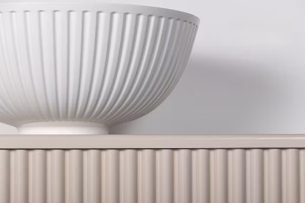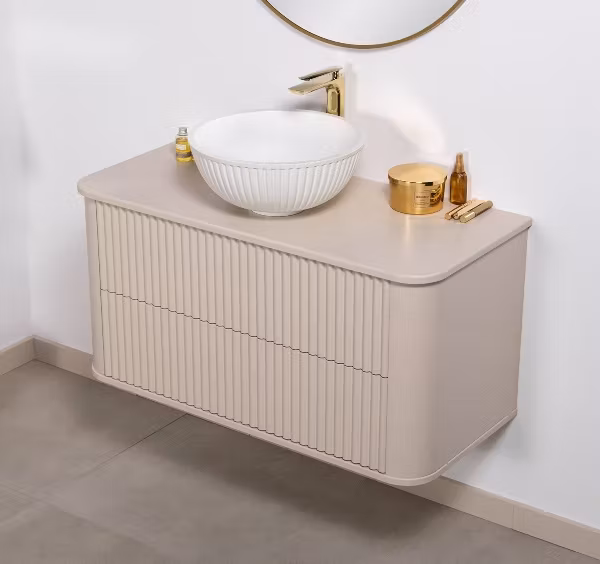 Vegghengt baderomsskap i matt sandfarge med rillet front – moderne eleganse og praktisk funksjon