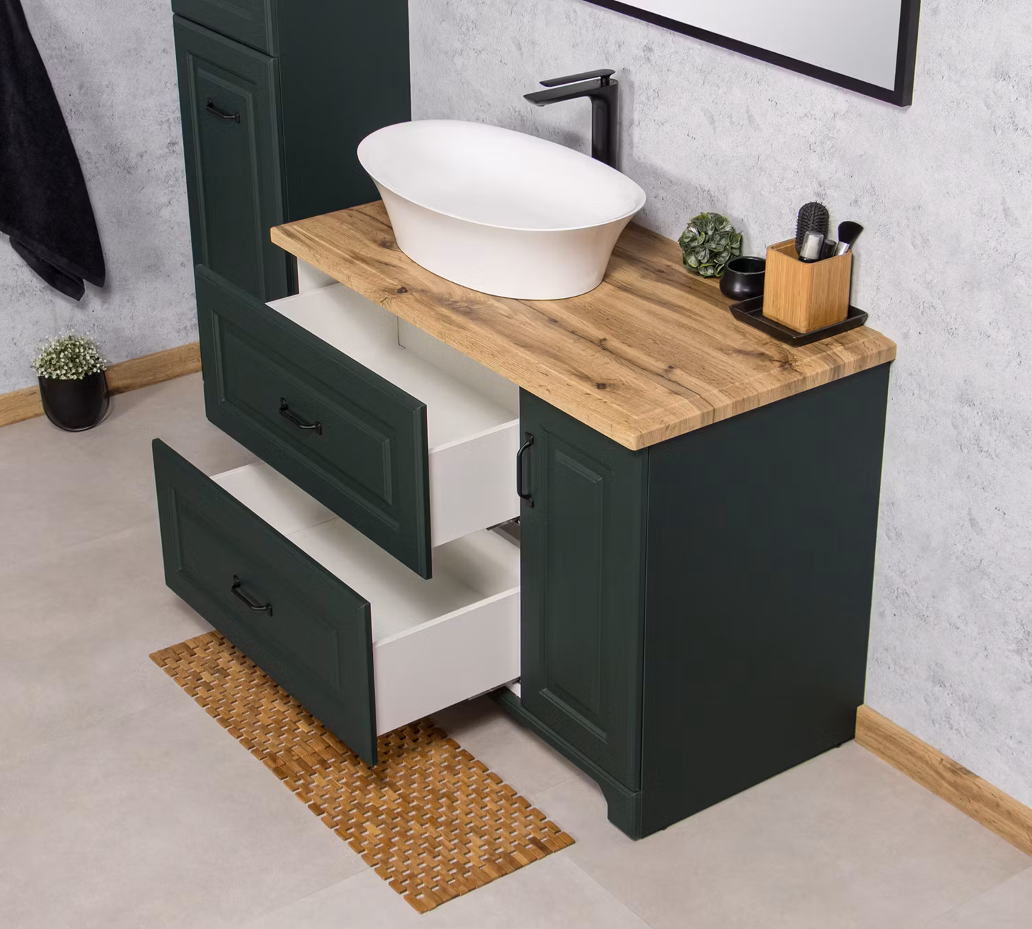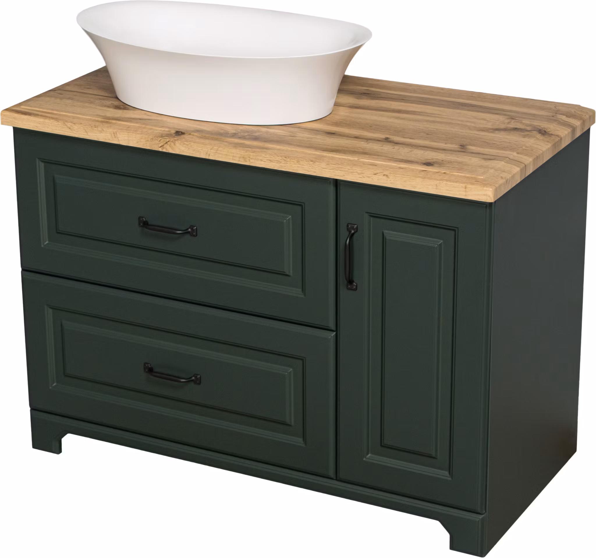 Skap en elegant og tidløs stil på badet med dette baderomsskapet. Skapet leveres i en grønn finish, komplett med benkeplate og matchende hvit dolomittservant. Harmoniske design kombinerer eleganse med funksjonlitet, og skaper en unik kontrast takket være kombinasjonen av den grønn fargen på skapet med den natur eiketoppen. Dette fargevalget reflekterer naturens skjønnhet, og gir interiøret friskhet og nytelse. Passer det til klassisk interiør.
